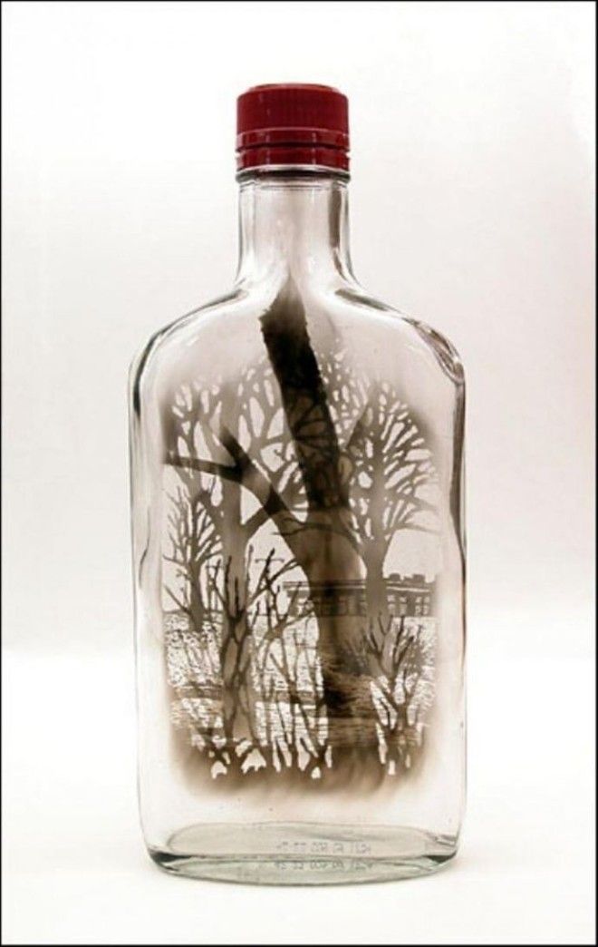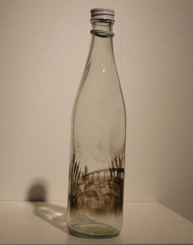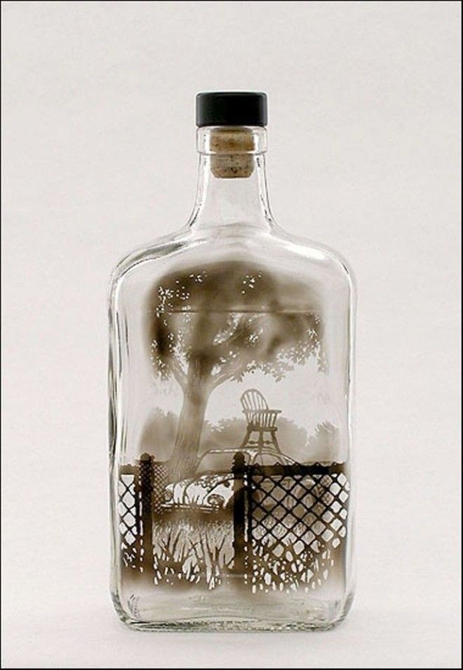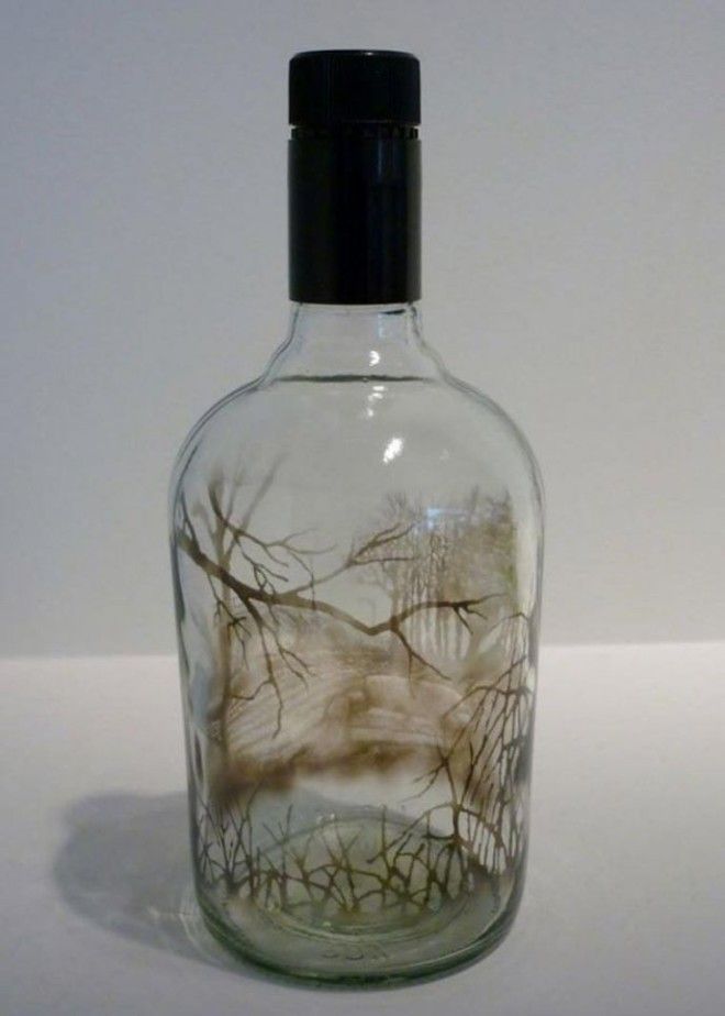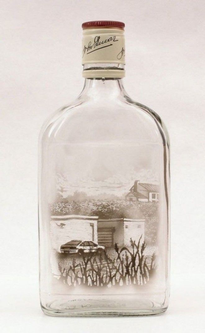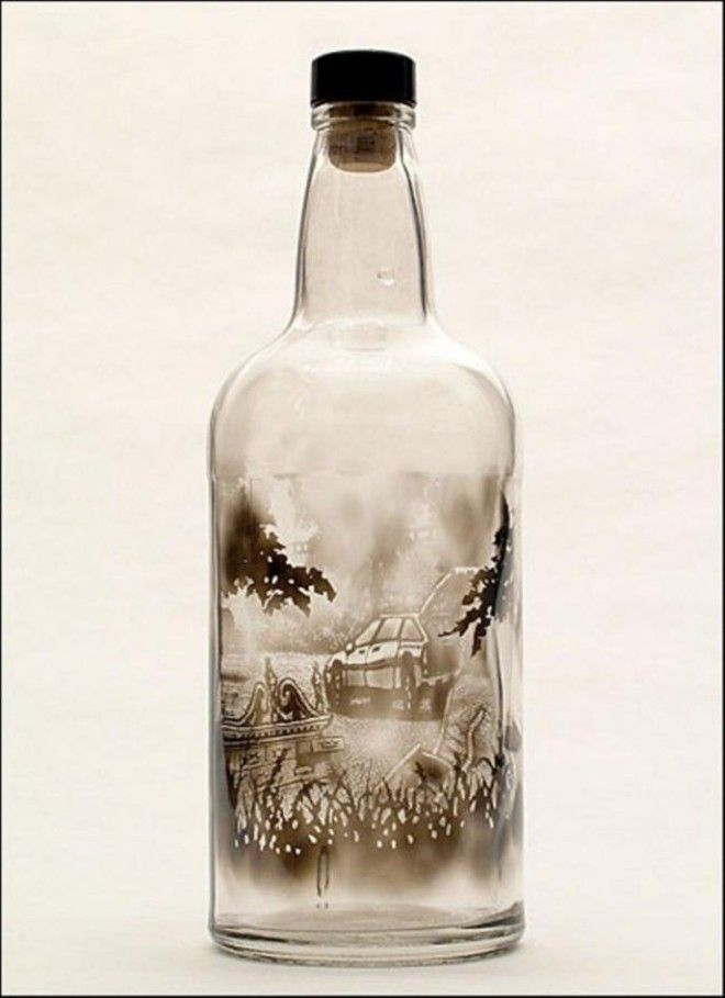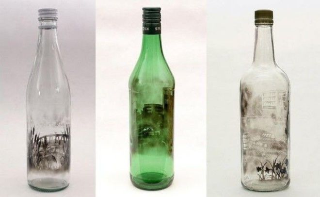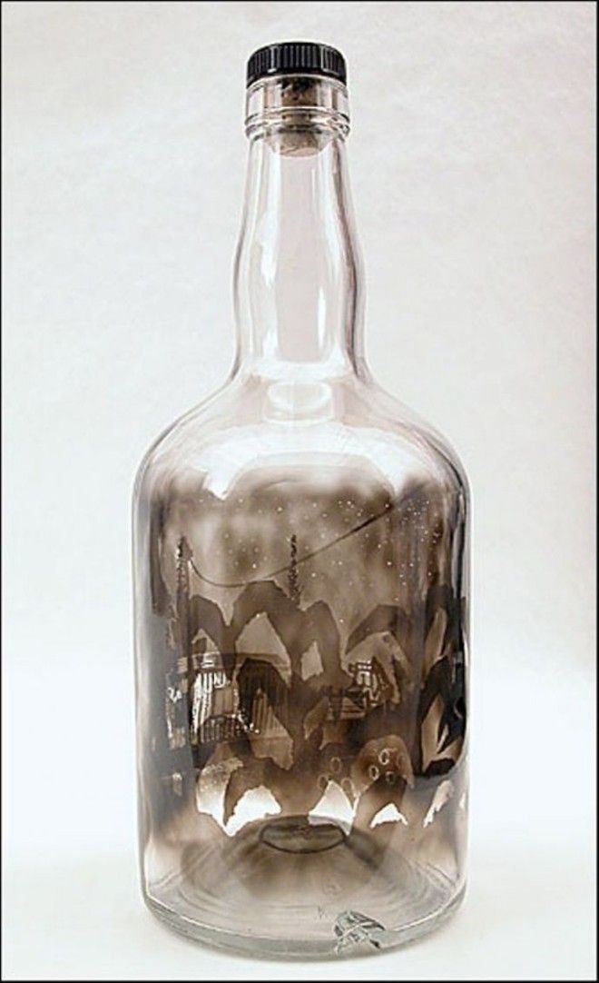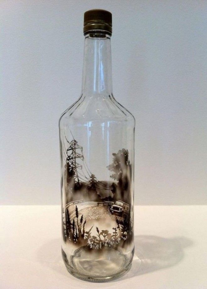 Джим Динджилиан уникальный художник, чьи работы расширяют горизонты искусства. Любая стеклянная тара — это холст для его необычных картин. Сначала бутылка наполняется дымом, затем осевшая сажа аккуратно стирается. Технология создания такого рисунка остается загадкой. Можно только догадываться насколько это тяжелый труд, но именно из-за такой технологически сложного и необычного нанесения получаются такие объемные и многослойные картины. А вот так художник говорит о своих работах: «Миниатюры, которые я создаю, изображают определенные места на окраинах мегаполиса, которые, несмотря на то, что всем знакомы, несут в себе тайну и даже какую-то угрозу». Предлагаем вам познакомиться с невероятными работами Джима Динджилиана.