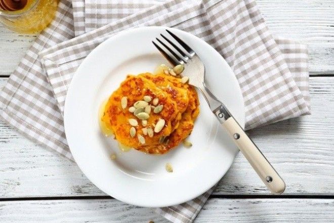 Хорошо перемешиваем и с помощью столовой ложки выкладываем полученную массу на сковороду в виде небольших оладий. Жарим на среднем огне с двух сторон до румяной корочки. При подаче посыпаем драники тыквенными семечками и кунжутом.