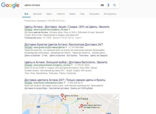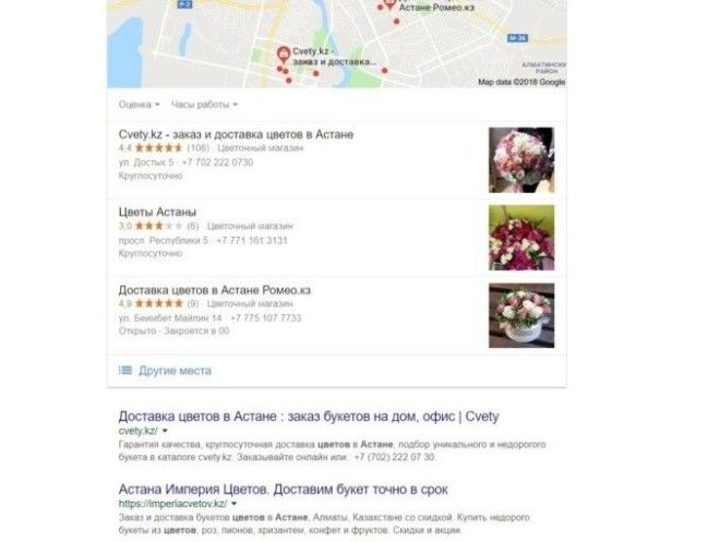 Давайте посмотрим выдачу по запросу «цветы Астана» в поисковой системе google.kz.