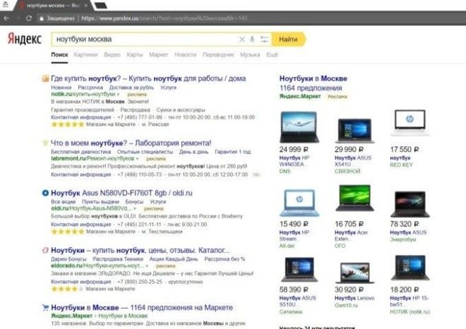 Аналогичная ситуация наблюдается и в выдаче «Яндекса». По запросу «Ноутбуки Москва» первый результат поиска не виден на первом экране, так как выше находится контекстная реклама и «Яндекс.Маркет».