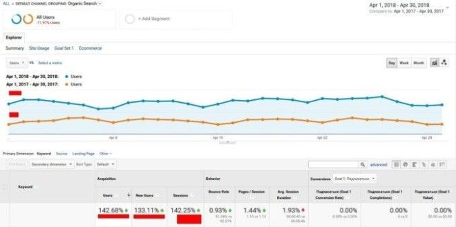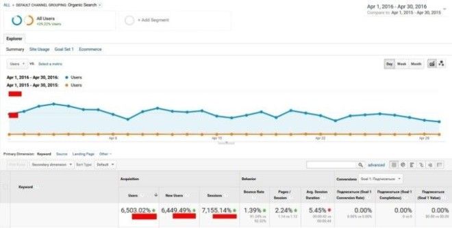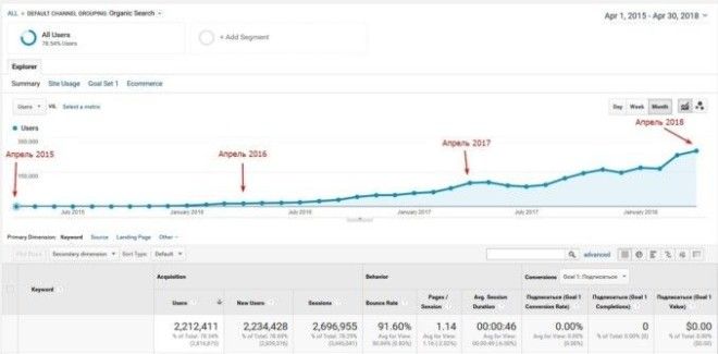 Если же сравнивать апрель 2015 года с апрелем 2018 года, то SEO-трафик вырос на 121 064,32%. Красивое число.