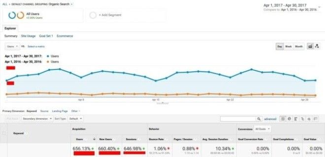 Сравнение 2016 и 2017 годов: относительный процентный показатель роста посещений — 656%.