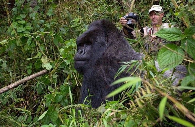 1. Кристоф со своим товарищем по фотографии во время знакомства с детенышем гориллы.