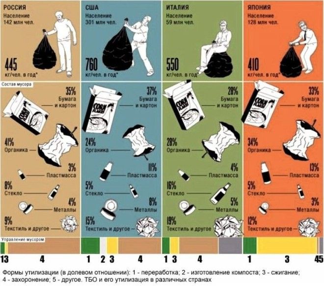 Жители соединенных штатов составляют всего 4% от общего числа людей, населяющих планету. Но, несмотря на это США является мировым лидером по производству отходов. Согласно статистике, каждый американец ежегодно отправляет на свалку 5 тонн мусора. Не исключение и самые юные жители страны. Так, за год в мусорном баке оказывается 18 млн. подгузников. Немалый мусорный вклад в общую картину привносят и любители газировки и пива. Если соединить алюминиевые банки из-под этих напитков, которые за год выбросили американцы, можно построить 10 башен, каждая высотой до Луны. К счастью, подобное строительство жителей США не интересует, весь алюминий подвергается переработке. А как иначе, если на разложение одной алюминиевой банки природе потребуется целых 80 лет. Подобные факты о мусоре наталкивают на тревожные мысли. Но, похоже, мусорная катастрофа Америке не грозит. Как утверждают социологии, средний американец скорее отнесет мусор на переработку, чем пойдет на выборы. Что ж, следует признать, в стране с победившей демократией явка на выборы редко превышает 60%.