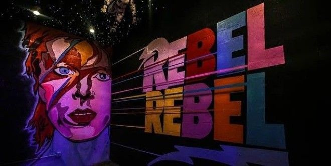 Здесь можно найти большую расписную стену "Rebel Rebel" вместе с обложкой альбома "Aladdin Sane", а также космонавтами, висящими с потолка бара, который украшен диско-шарами, неоновыми молниями и другими альбомами Дэвида Боуи.