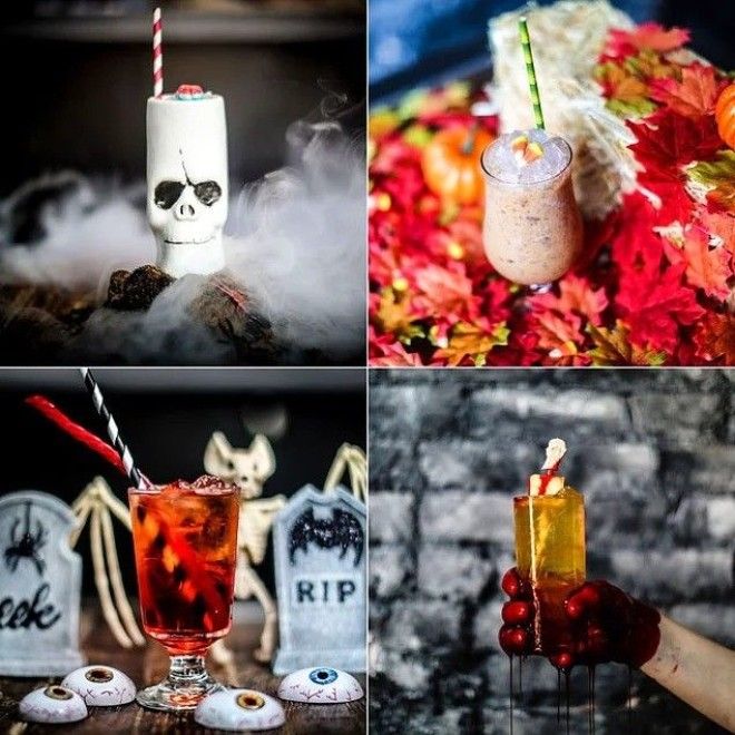 Что касается коктейлей, в баре представлено 10 напитков на тему Хэллоуина, в том числе один из которых носит название "Мозги!" (херес, бренди, ликер "Luxardo Maraschino", корично-грейфрутовая смесь, инжир и лайм). Наиболее интересные коктейли бара - «Дэвид С. Тыква» (выдержанный ром, ямайский ром, коньяк, херес, кокос, тыква), «Мертвые будут ходить по Земле» (текила и тоник из копченого ананаса) и «Битлджус, Битлджус, Битлджус!» (апероль, кампари, испанский вермут и газировка) - изображены ниже по часовой стрелке, начиная с верхнего левого угла.