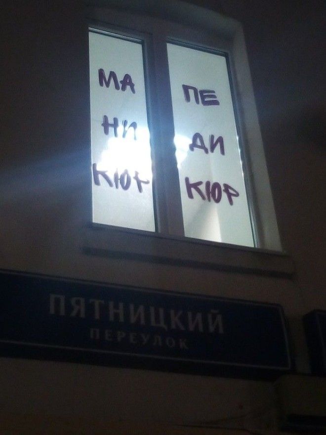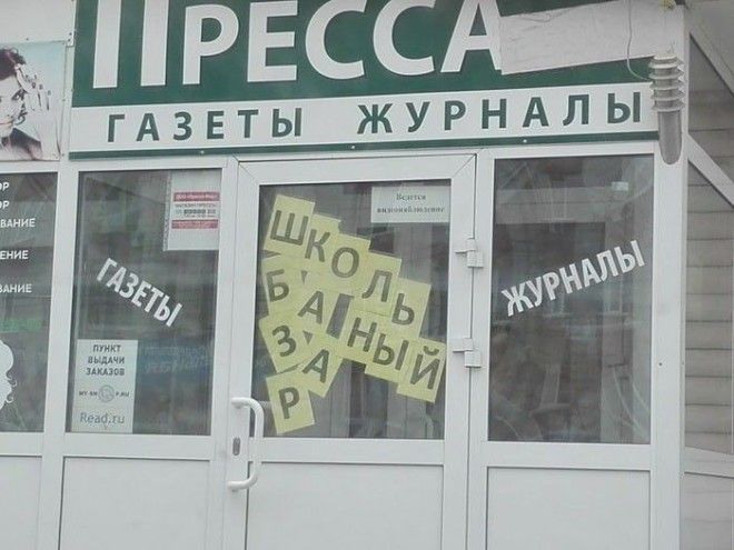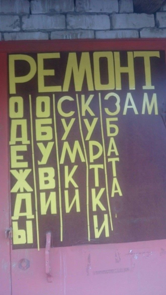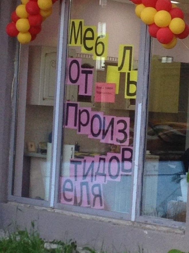 Желание быть не таким, как все, частенько оборачивается небольшими (или крупными) провалами, ведь в подобных случаях люди думают вовсе не о качестве, а о необычности. В погоне за ней дизайнеры и прочий креативный люд иногда создают такие шедевры, что не знаешь, с какой стороны к ним подойти. Особенно часто страдают ни в чём не повинные вывески, афиши и баннеры, которые первыми бросаются в глаза клиентам и покупателям, а значит вынуждены поражать их своей необычностью. Но чаще всего они просто вызывают неконтролируемые похихикивания.
