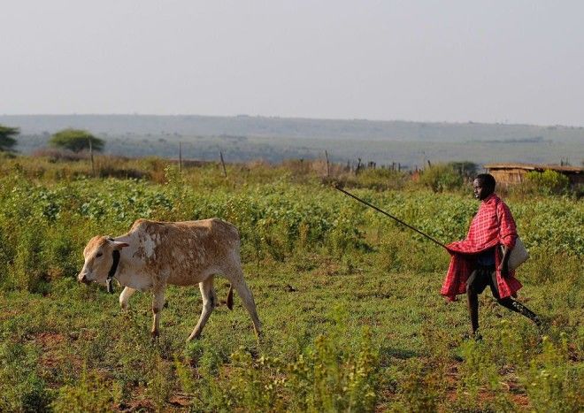 5. 12-летний Кельвин Леадизмо со школьным портфелем на плече пасет рогатый скот своей семьи перед тем, как отправиться в школу. Снимок сделан в поселке Кишима, северный уезд Самбуру, Кения, 17 июля 2013 года. Дети сообщества Самбуру, как правило, не успевают посещать обычные дневные занятия в ближайшей начальной школе Лолтулелей. Поэтому в школе работает параллельная программа обучения, в рамках которой проводят образование будущих пастухов. Курсы ведут учителя-добровольцы.