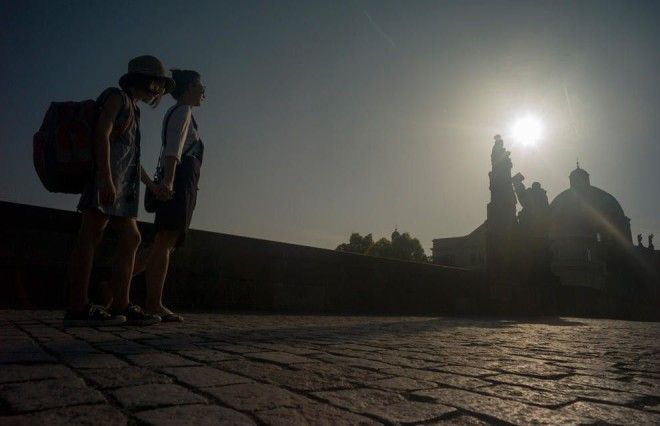 21. 7-летняя Эма Ланска идет с мамой по Карловому мосту на пути в школу в Праге, 18 июня 2013 года.