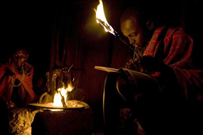 30. 12-летний Кельвин Леадизмо выполняет свою домашнюю работу при свете костра в маньятте (традиционный дом) своей семьи в поселке Кишима, Кения.