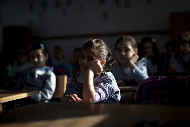 33. Дети сидят в своем классе в первый день нового учебного года в городе Газа, 25 августа 2013 года.
