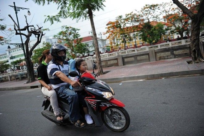 34. 7-летняя Чамая Памутито возвращается из школы домой на скутере вместе со своим отцом и матерью в Бангкоке, 6 июня 2013 года.