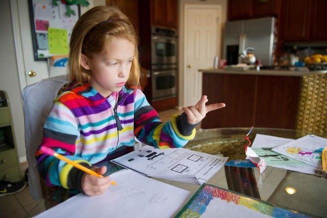11. 8-летняя Дженезис Туазон, ученица 3-го класса начальной школы Пангуло, выполняет домашнее задание в своем доме в Малабоне, Манила, Филиппины, 14 июня 2013 года.