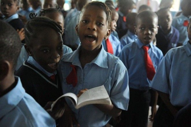 36. 7-летняя Омозе Огуогхо поет во время утреннего собрания в частной школе в Ибафо, штат Огун, Нигерия, 6 июня 2013 года.