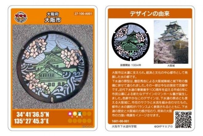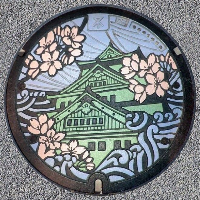 Осака – экономический и культурный центр Японии, основанный Тоётоми Хидэёси, известен также в качестве «японской Венеции» благодаря интенсивному речному сообщению. Часть канализационной системы, созданной во время сооружения замка и призамкового города, функционирует до сих пор. На крышке люка имеется изображение городского символа – цветущей сакуры.