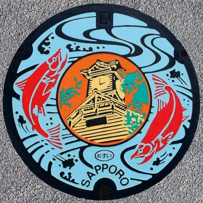 В городе Саппоро есть река Тоёхира, по которой против течения поднимается лосось, прозванный местными жителями, айну, «рыбой богов». Одно время ухудшение качества воды повлекло за собой исчезновение рыбы, однако развитие канализационной системы внесло свой вклад, и в последнее время по реке ежегодно поднимается около двух тысяч рыб. На крышке люка изображен идущий в верховье реки лосось и символ города – башня с часами.