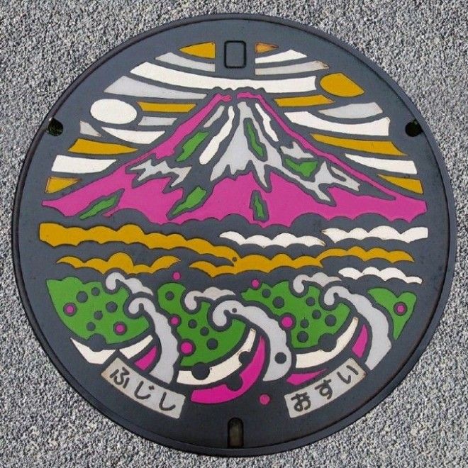 На крышке – изображение горы Фудзи, зарегистрированной в качестве Всемирного наследия ЮНЕСКО, и гребней волн в бухте Суруга. Дизайн напоминает серию картин укиё-э «36 видов Фудзи» известного мастера эпохи Эдо Кацусики Хокусая. Крышки установлены по всему городу таким образом, чтобы изображённая на них вершина горы Фудзи показывала направление течения сточных вод.