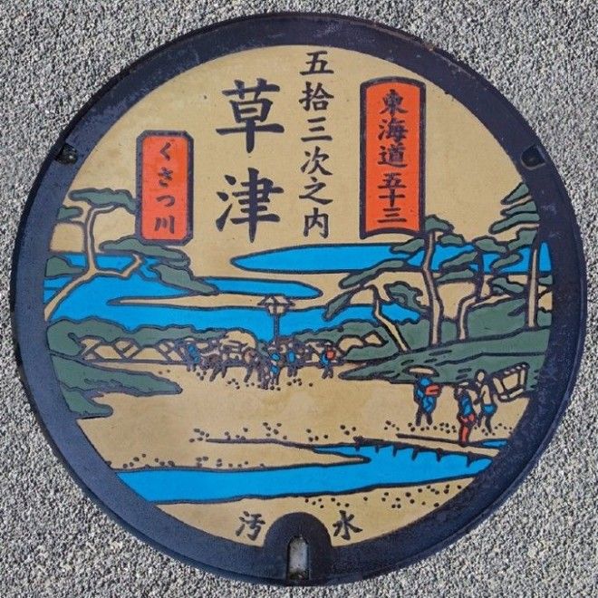 Крышка создана по мотивам гравюры с изображением Кусацу из серии «53 вида Токайдо» известного мастера укиё-э эпохи Эдо Утагавы Хиросигэ. В эпоху Эдо Кусацу развивался в качестве 52-й станции Токайдо, находящейся на пересечении дорог Токайдо и Накасэндо. В городе сохранился постоялый двор Хондзин, – один из крупнейших в Японии дворов, где останавливались на ночлег феодалы-даймё и государственные лица.