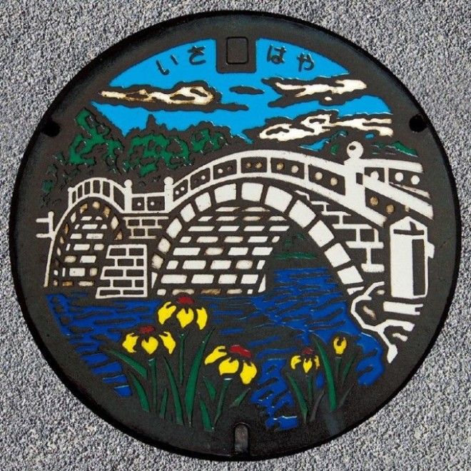 Каменный мост Исахая стал первым зарегистрированным в Японии объектом важного культурного наследия. Мост был сооружён на реке Хоммё в эпоху Эдо из-за частных наводнений, и сохранился по наши дни, став городским символом. Цветы в нижней части крышки – ирисы Исахая.