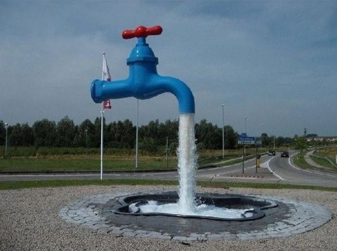 В Испании, Канаде, Швейцарии и, возможно в других местах, вы можете встретить на центральных площадях либо у крупных торговых (административных) центрах необычную скульптуру в виде парящего в воздухе крана. Большинство людей задаются вопросом, как же этот кран висит в воздухе. И тут на помощь этим людям приходит ваш любимый сайт интересных фактов. А разгадка этой скульптуры очень проста - в струе воды установлена полупрозрачная труба, по которой стекает вода и на которой держится кран.