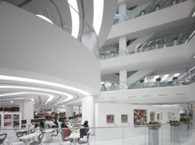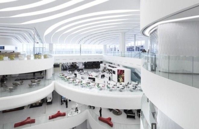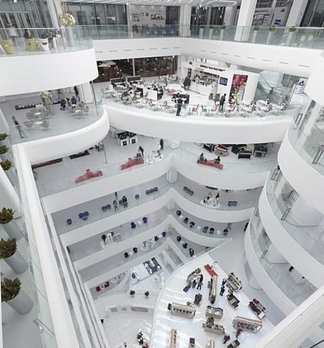 Интерьер торгового центра – это ряды белоснежных полукруглых платформ, каждая из которых создает эффект постоянного движения.