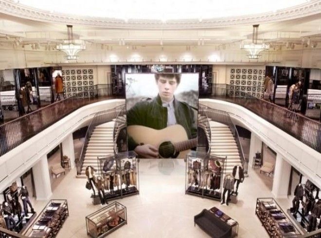 Внутри магазина установлено сто цифровых экранов, транслирующих содержание официального сайта марки, показы на неделях моды и т.д.