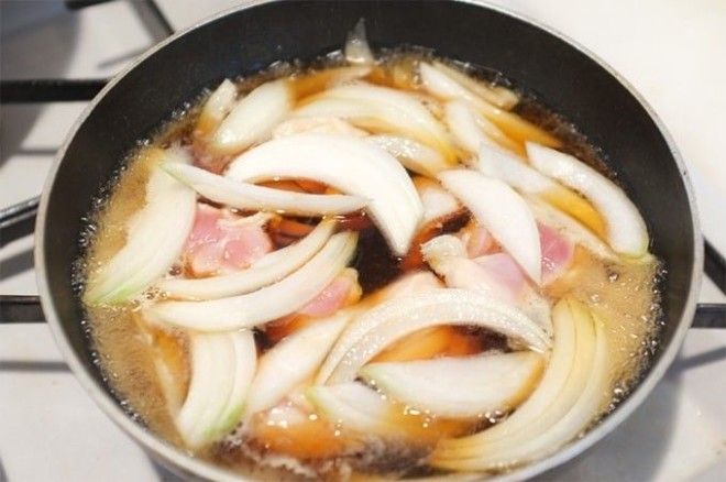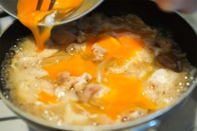 - Чтобы оякодон вышел красивым, белки и желтки вливают по отдельности и варят разное время, благодаря чему желтки получаются полужидкими. Если же нет времени разделять, можно вливать и всё сразу.